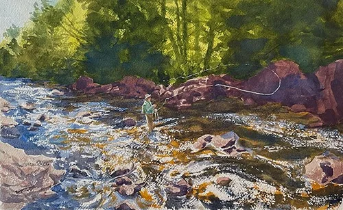 The Namakagon River in northern Wisconsin is designated a Wild and Scenic River. I have experienced many moments like this while canoeing down that awesome river, and wanted to capture one in watercolor. Copyright © 2024 Peter Borden. (12” x 9”) $90